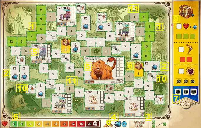 The adventures all show a similar structure: Centrally you find the area with numerous numbered fields (small) and some large spaces with monsters.